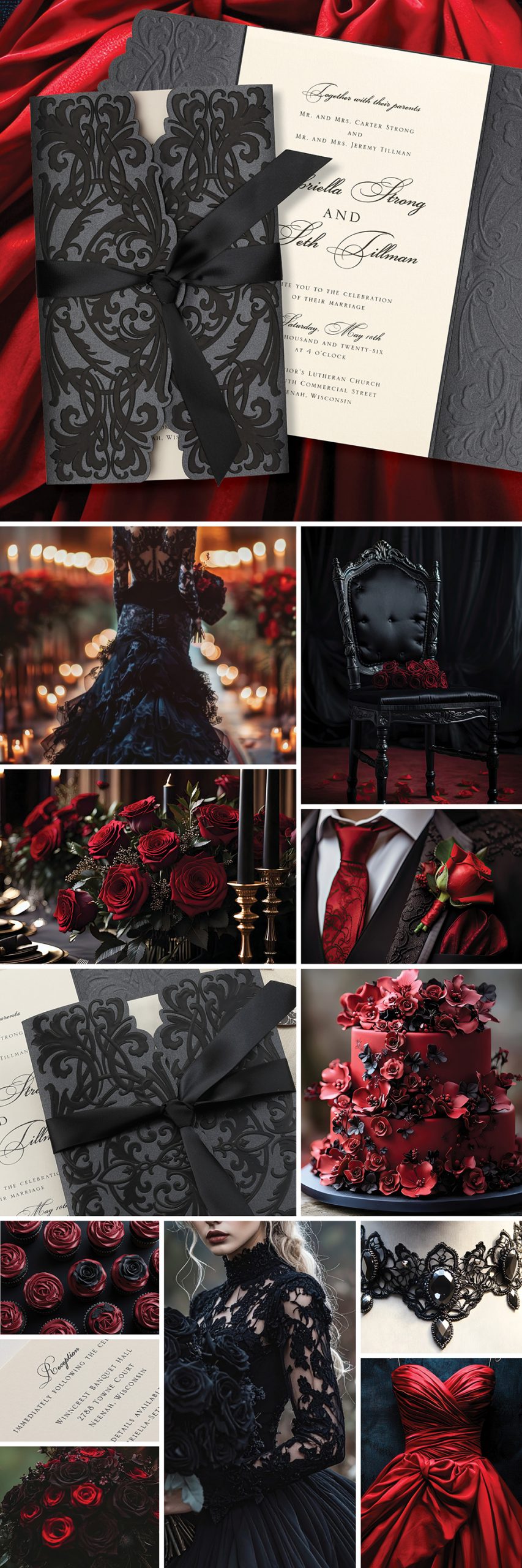These designs do more than share the details. They set the tone and give guests a glimpse into a celebration that feels romantic, a little dramatic, and full of personality.